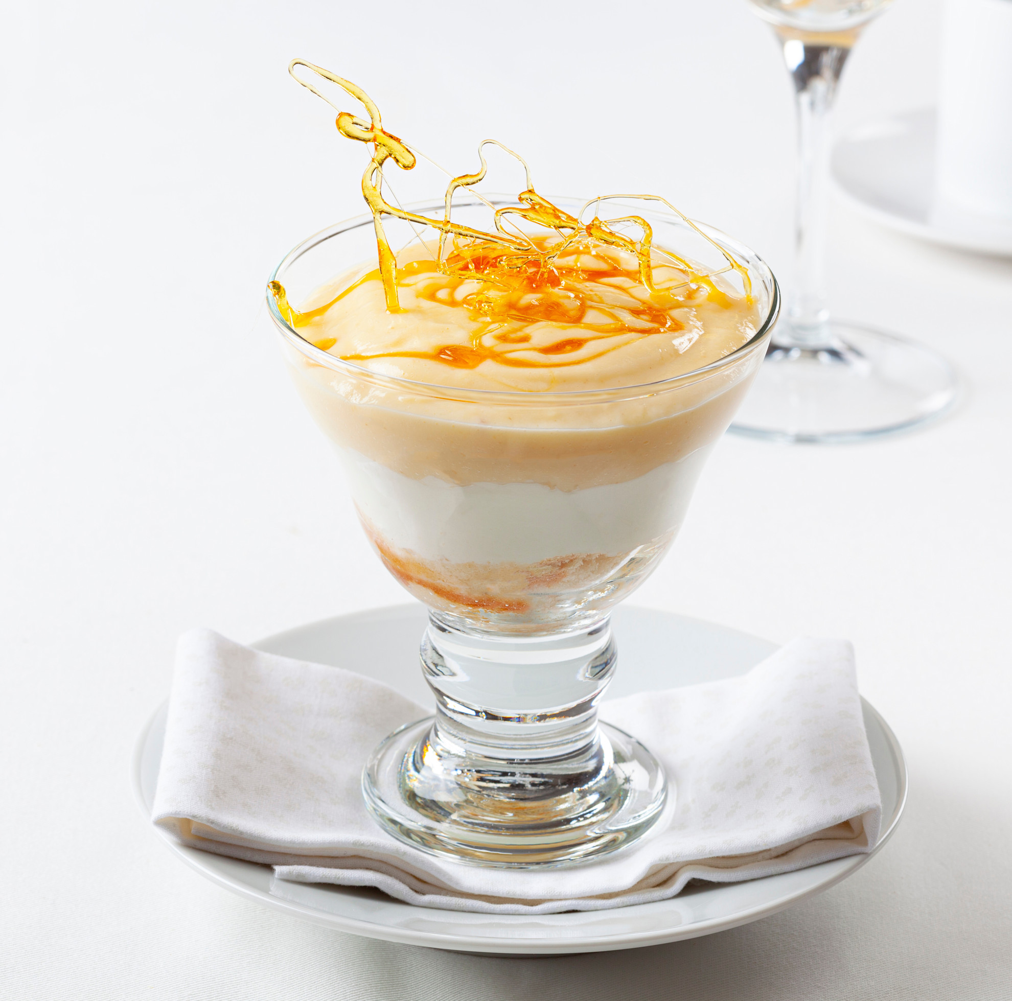 Goxua is a similarly rich, creamy dessert, which features liquor-soaked ladyfingers, cinnamon, and a caramel sauce topping.