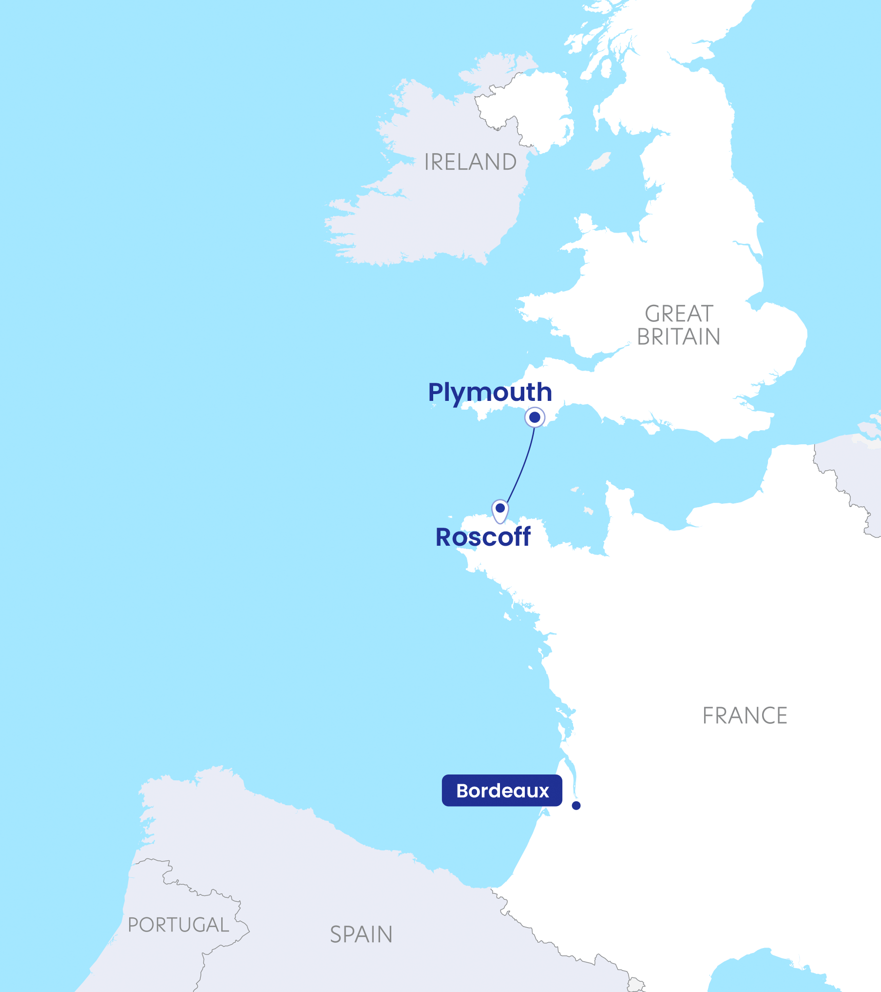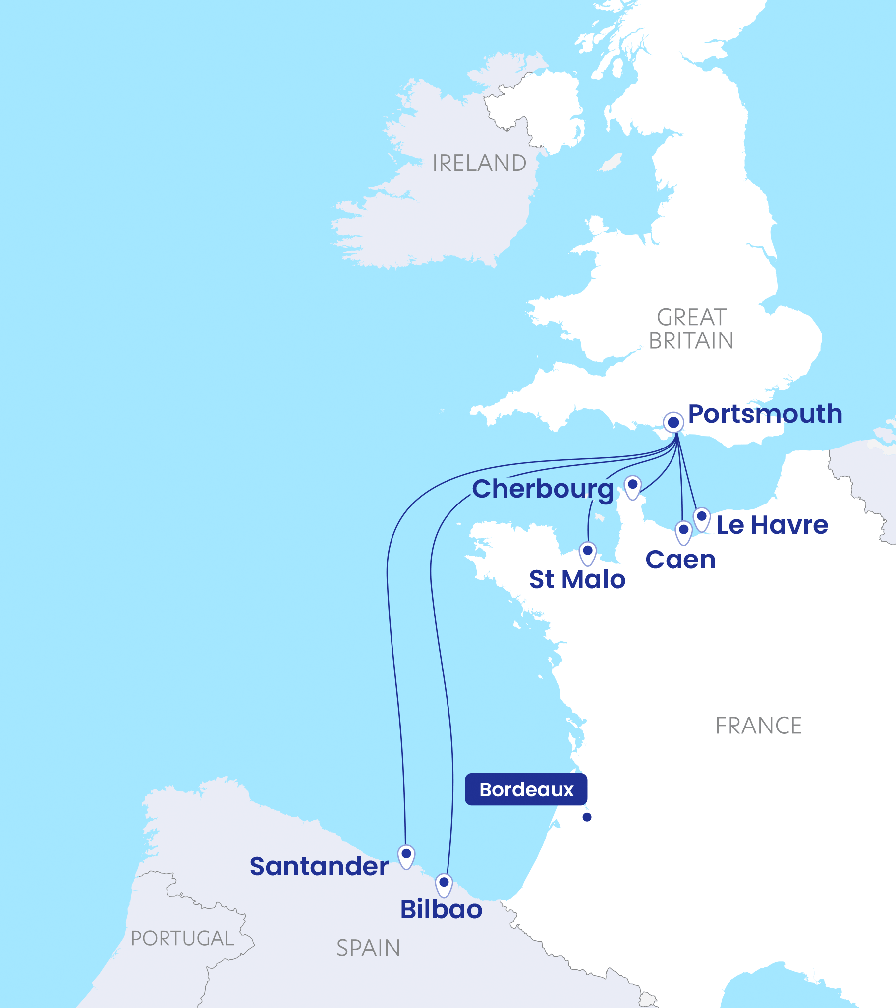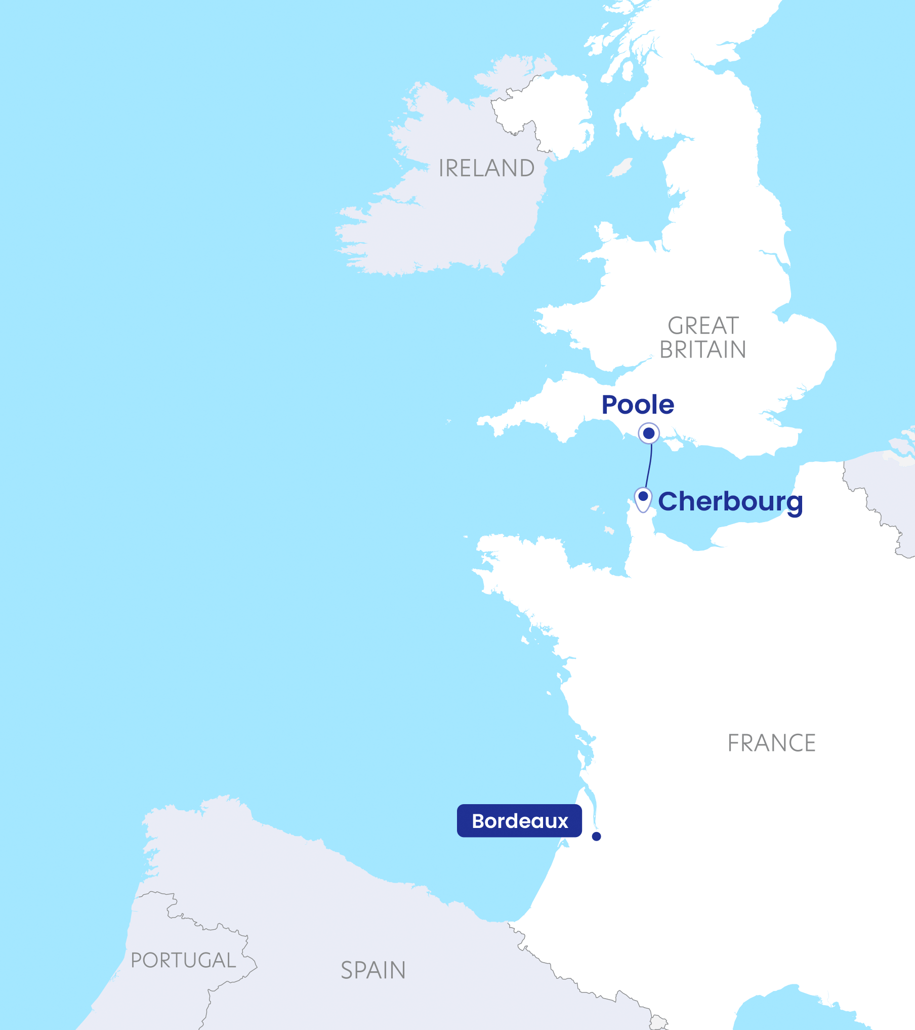 Explore our ferry routes with arrivals in both France and Spain. Choose the route that best fits your trip to Bordeaux!